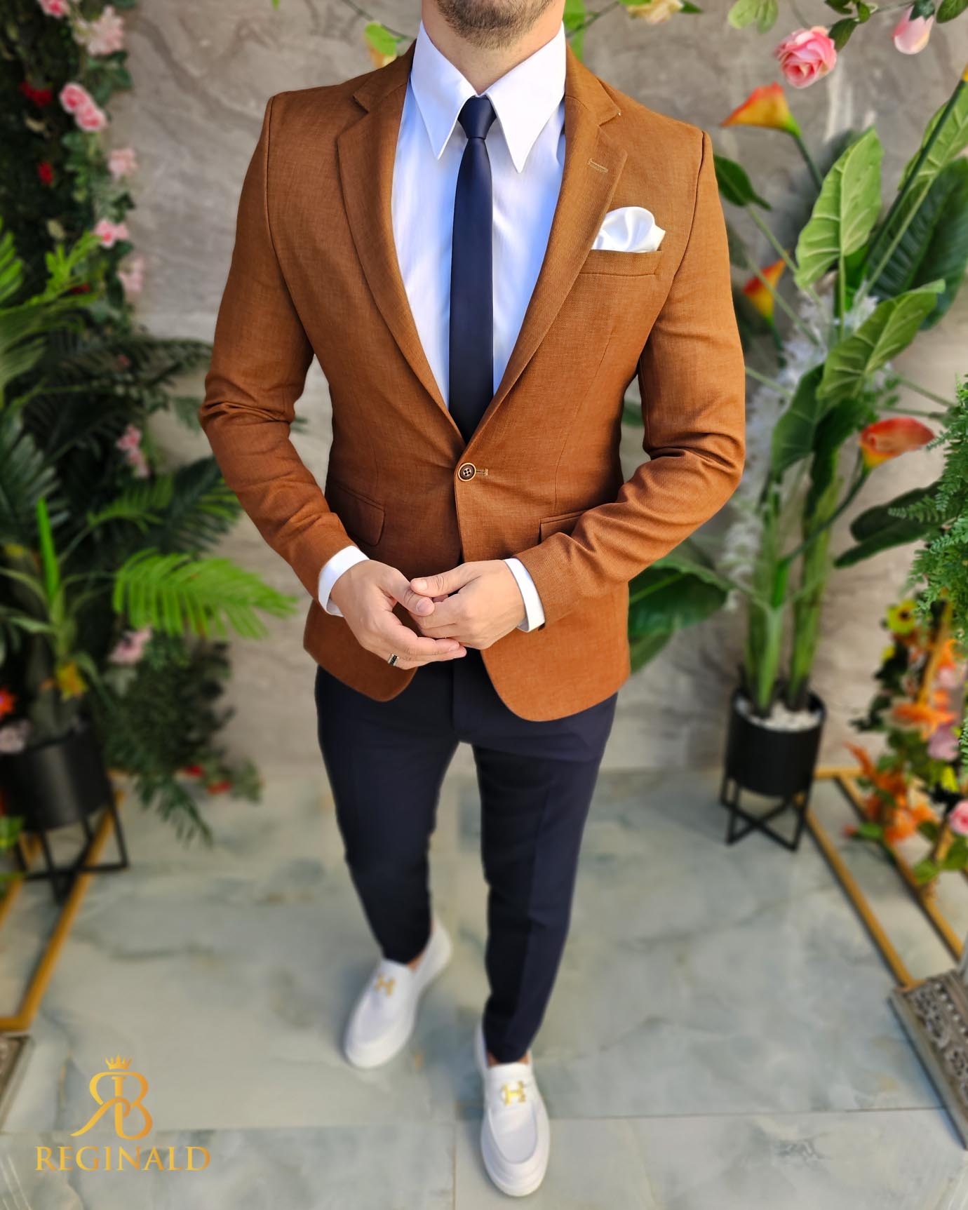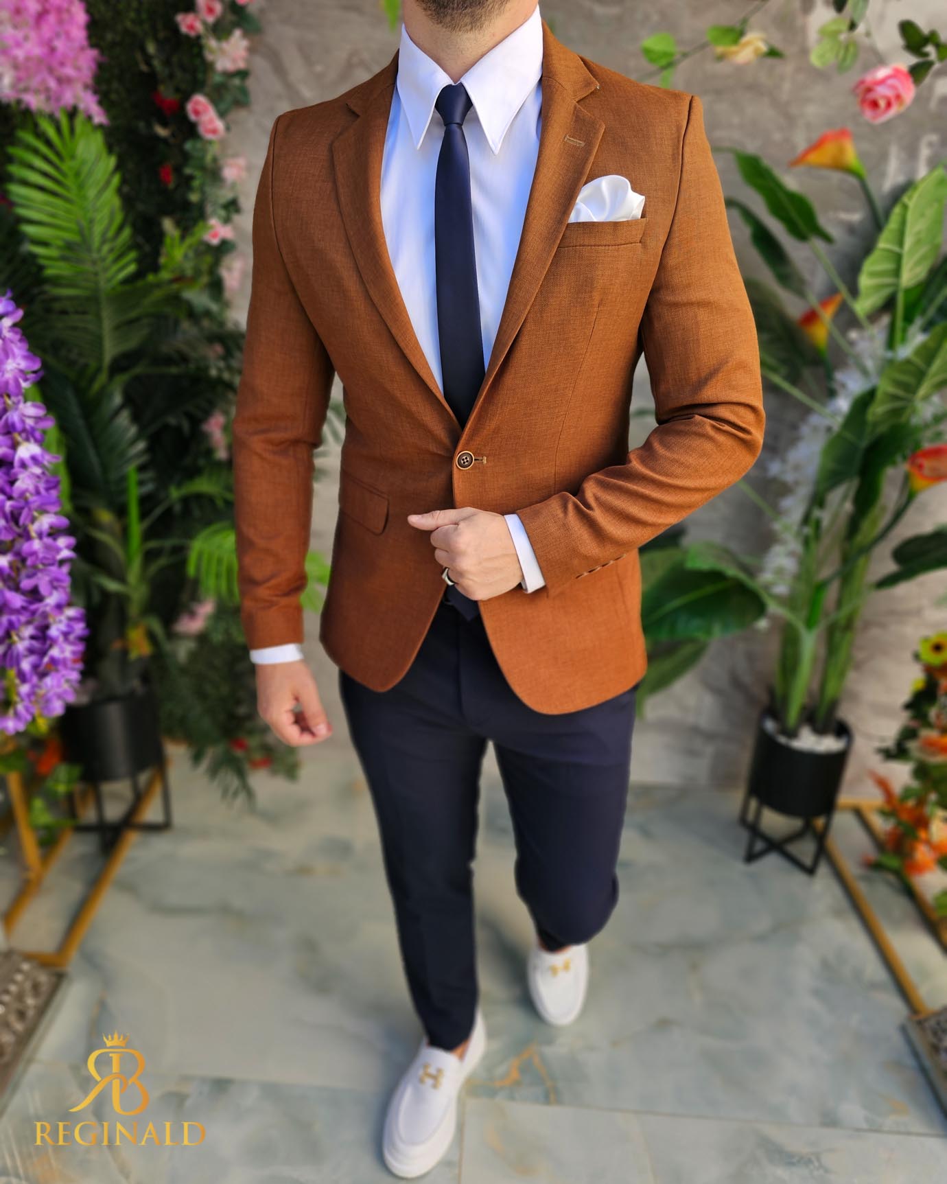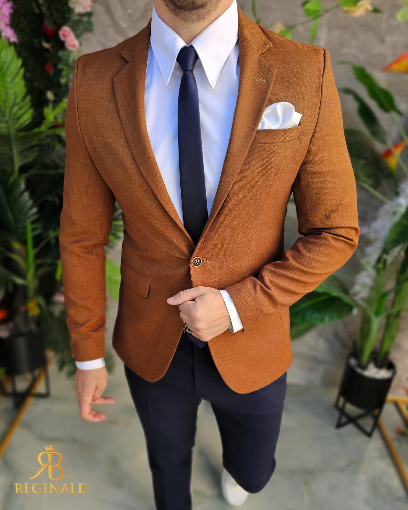 În general, un sacou de bărbați slim fit cu prindere într-un singur nasture poate fi purtat cu o cămașă elegantă și pantaloni asortați, pentru un aspect elegant.