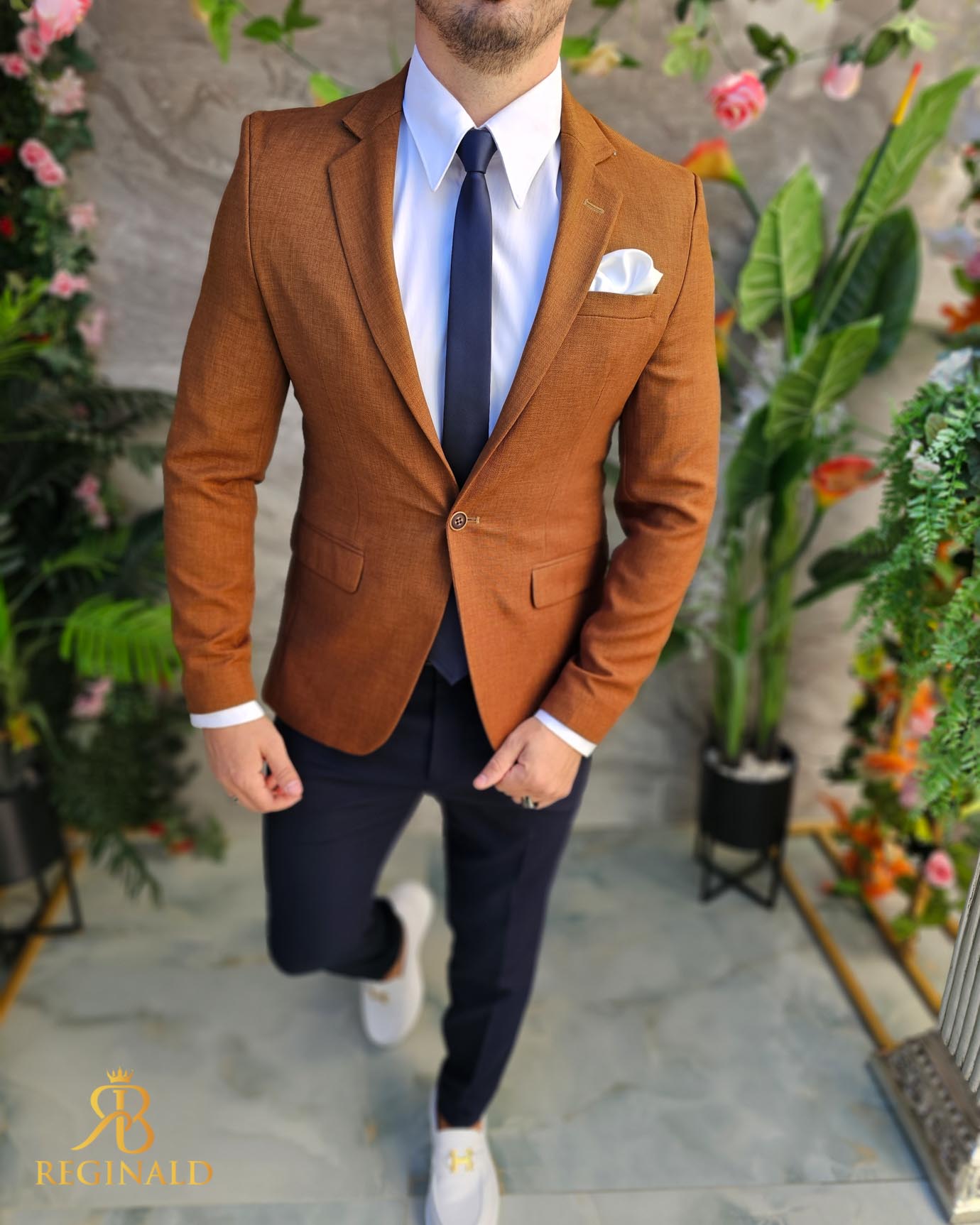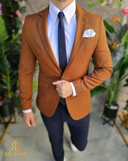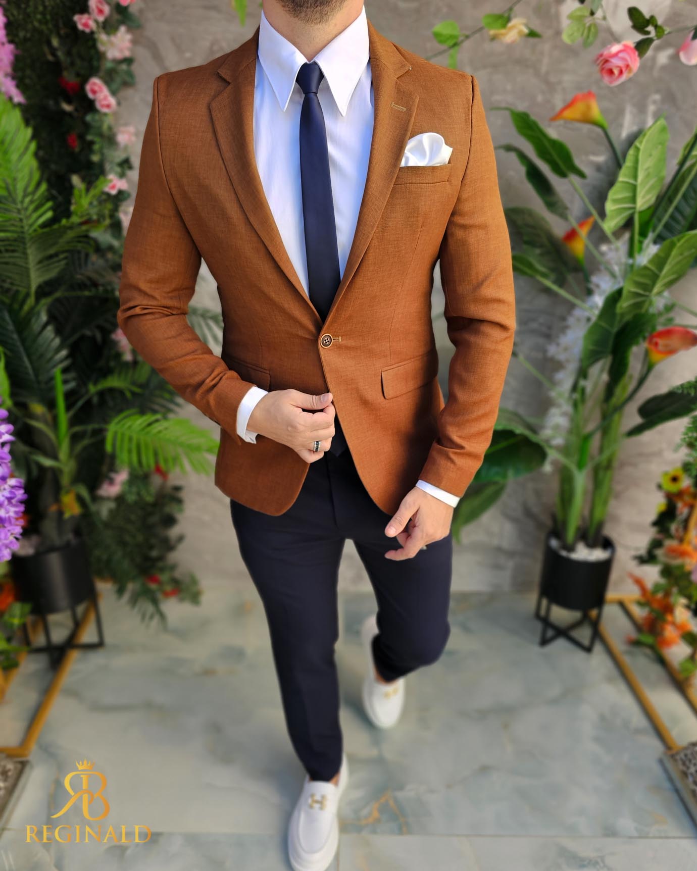În general, un sacou de bărbați slim fit cu prindere într-un singur nasture poate fi purtat cu o cămașă elegantă și pantaloni asortați, pentru un aspect elegant.
